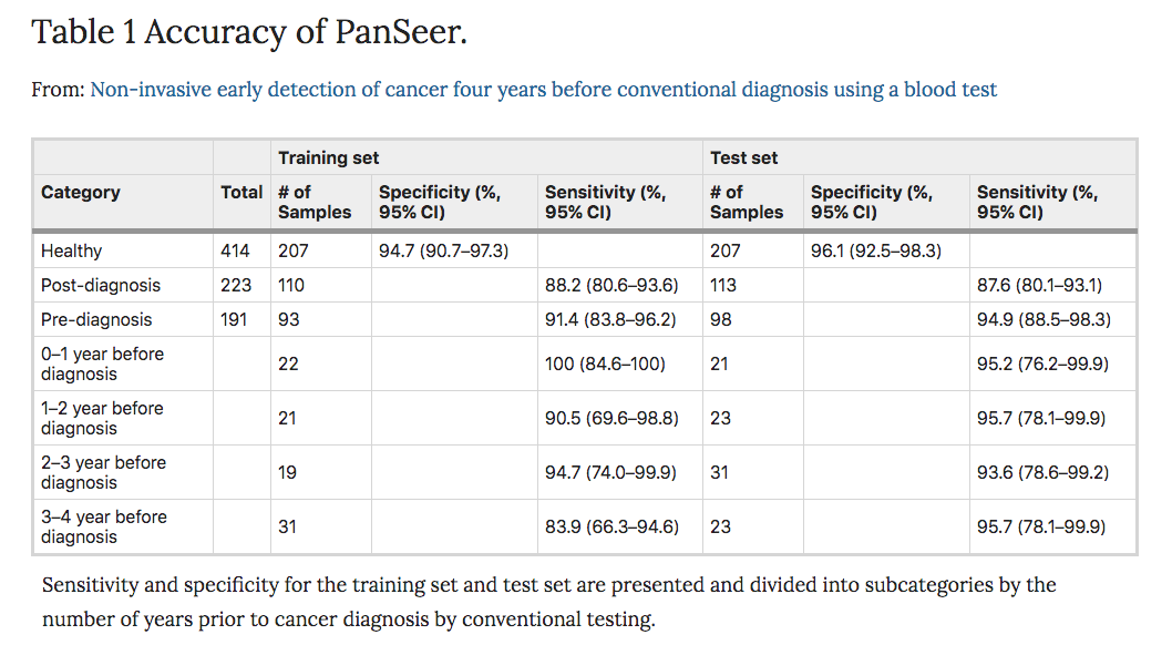 研究开展过程中,科研团队基于ctDNA甲基化特质设计了一套机器学习方法。在一个独立的测试样本集中,该研究团队在207个健康对照样本重现96%的特异性的前提下,在113个确诊后采集的病人样本上达到了88%的敏感性。接下来,在98名未确诊之前1-4年采集的样本中PanSeer技术达到了95%的检测敏感性。