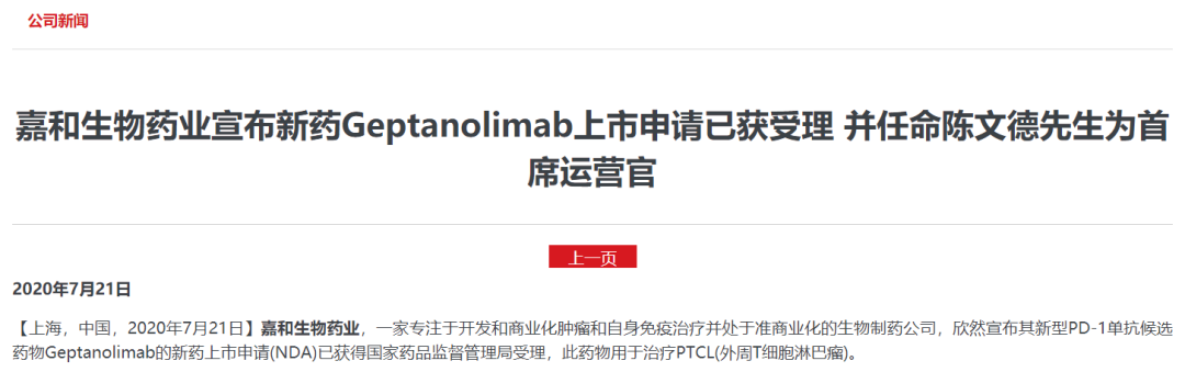 7月21日,嘉和生物宣布,其PD-1抗体杰诺单抗注射液(Geptanolimab) 的新药上市申请(NDA)已获得中国国家药品监督管理局(NMPA)受理,用于治疗外周T细胞淋巴瘤(PTCL)。