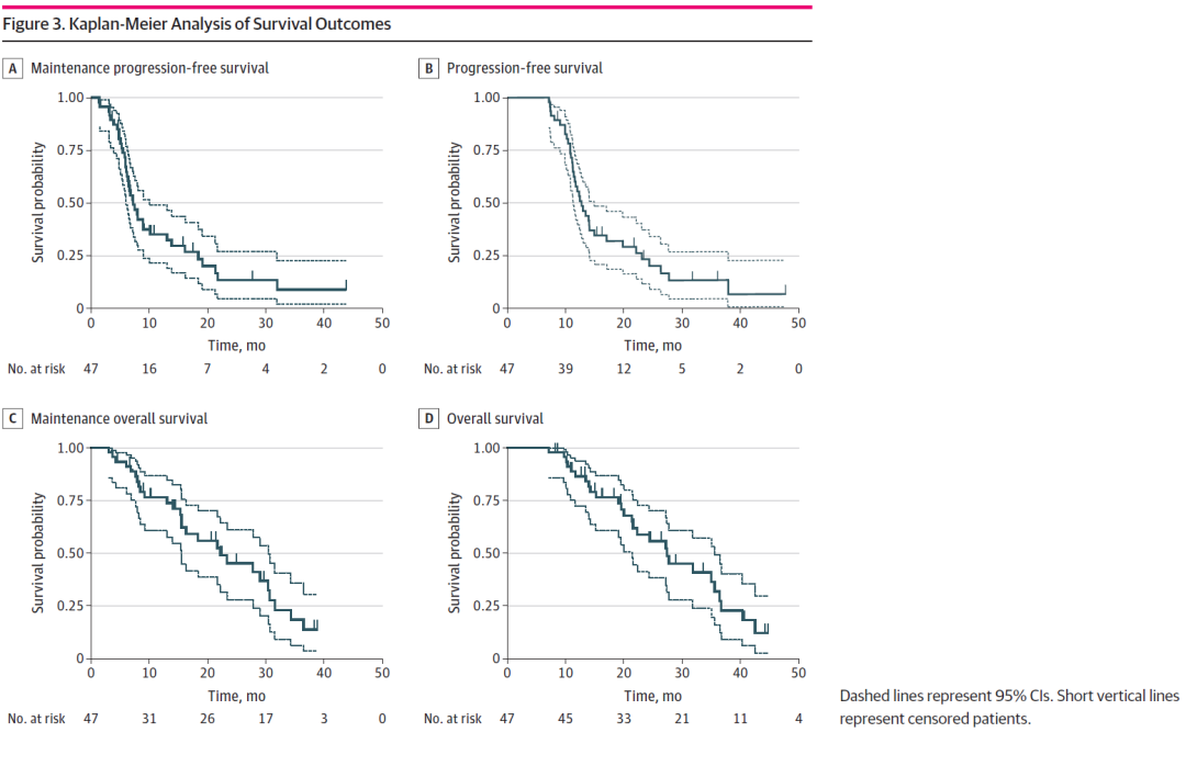 一共有47例患者接受了维持治疗,中位年龄为52岁(范围:25-81岁),32人(68%)为男性。维持治疗的中位无进展生存期(PFS)为7.2个月,全程治疗的中位PFS为12.7个月,中位总生存期(OS)为27.4个月。