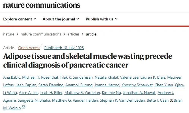 导读:胰腺癌患者通常会出现体重减轻和肌肉萎缩。脂肪组织和骨骼肌的消耗是否在诊断前就开始了,以及这种消耗在早期癌症检测中的潜在效用尚不清楚。