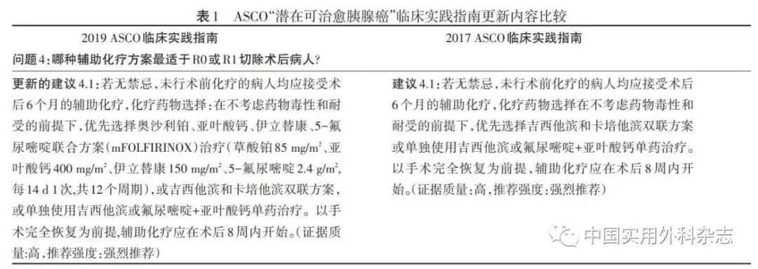 2019版ASCO指南推荐R0切除术后患者均应常规行6个月的辅助化疗,化疗方案为优先选择奥沙利铂、亚叶酸钙、伊立替康、5-氟尿嘧啶联合方案(FOLFIRINOX)治疗,这一点与之前颁布的指南以及其他指南有较大的不同,是一次较大的突破(表1)。