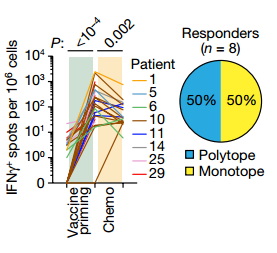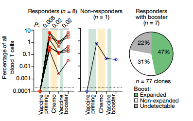 研究者采用了一种全新的数学策略和免疫学方法,使用治疗前后外周血样本的 T 细胞受体 (TCR) Vβ 测序来识别治疗扩增的T细胞克隆量。利用该技术,研究者一共纳入了16位PDAC患者,其中发现:在所有8个发生应答反应的受试者(以下简称应答者)和8个未发生应答反应其中之一受试者的样本中,研究人员都检测到了疫苗诱导的克隆扩增。在应答者中,所有样本均鉴定出多个扩增克隆(中位数为7.5),占血液 T 细胞总数的 10%。