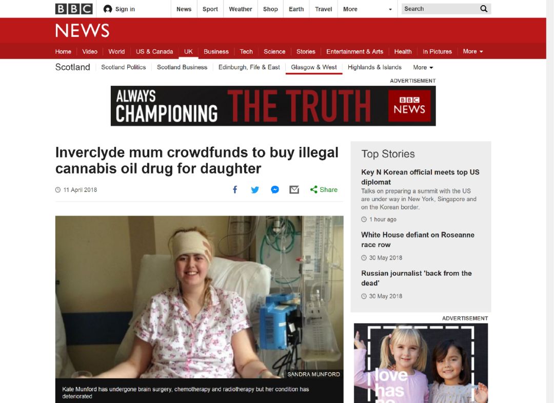 2018年4月11日,BBC报道:无奈母亲将大麻油视为脑瘤女儿最后的希望。专题报道英国女孩凯特用大麻油治愈自己脑瘤的故事。