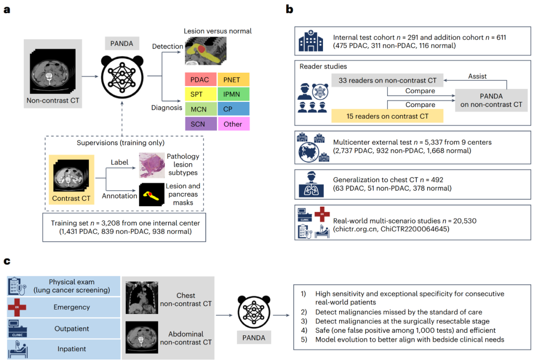 上图 a 为模型开发,PANDA 以平扫 CT 为输入,输出可能发生胰腺病变(包括 PDAC 和其他 7 种非 PDAC 亚型)的概率和分割掩码。PANDA 接受了病理学确认的病患级标签和增强 CT 图像上标注的病变掩码的训练。b 为模型评估,评估 PANDA 在内部测试组、平扫和增强 CT 、外部测试组、胸部 CT 组等真实世界多场景研究中的性能。c 为模型临床转化。