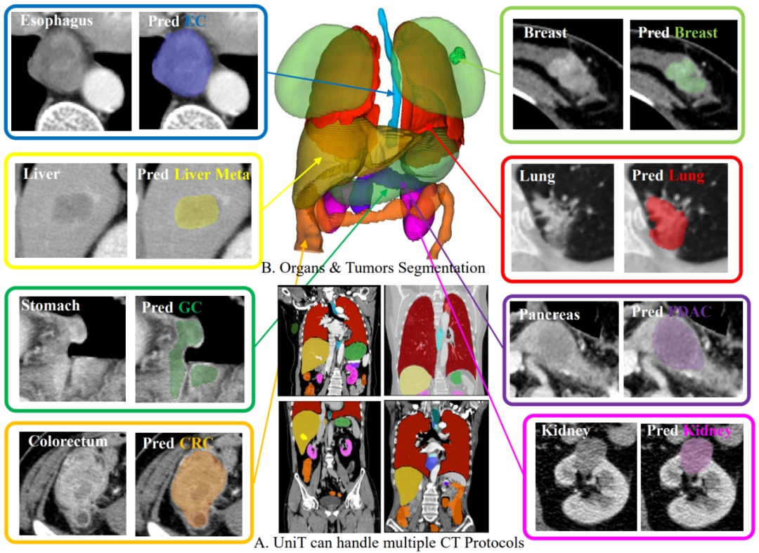CancerUniT 检测、分割和诊断 8 种癌症肿瘤的示例。图源:https://arxiv.org/pdf/2301.12291.pdf