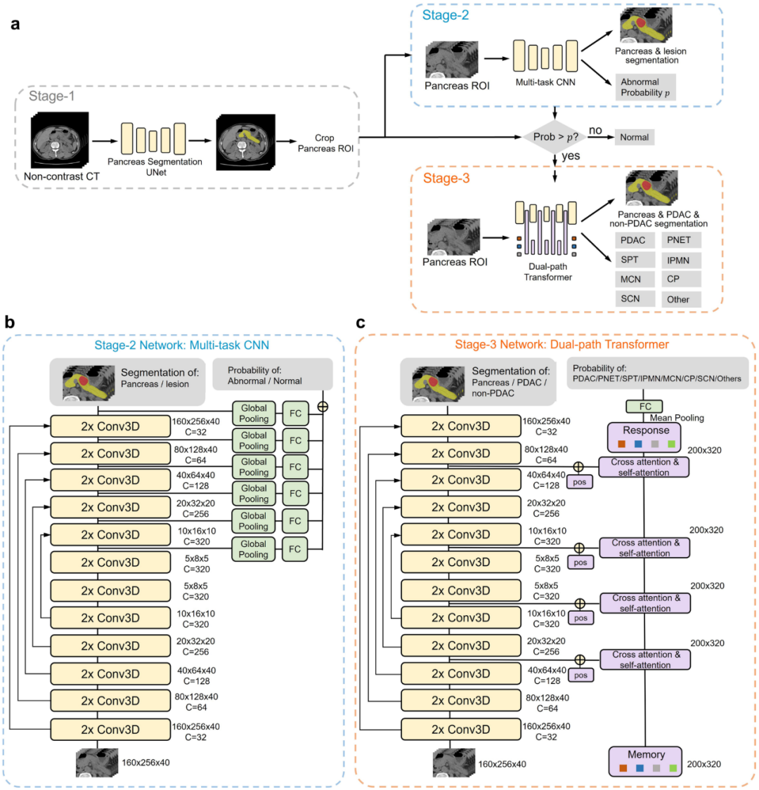 达摩院医疗 AI 高级算法专家、也是这次 PANDA 项目负责人张灵进一步解释称,PANDA 并不是一个单纯的视觉分割模型,它兼具了分割、检测和分类功能,其深度学习框架(下图)包括以下三阶段,每个阶段「各司其职」。