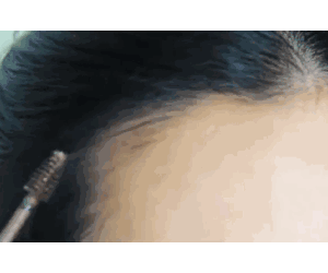 再选一只与发色接近深棕或者浅灰色睫毛膏或者眉胶,轻轻刷在额角两边的软毛上,其中的纤维物质能提高额角软碎发的存在感,让TA们更好达到修饰额头形状和发际线的作用;