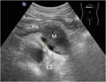 其次,确定超声引导的方向及入路,以避开重要器官及血管等,沿着超声引导线方向缓慢进针,如遇到呼吸运动而产生探针移位时,要随时调整,以保证按预先安排的入路进针。