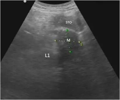 第三种表现为较小的肿块,内部大多数为均匀低回声,后方声衰减不明显;较大肿瘤呈混合回声,后方回声衰减,也可以看到坏死液化的无回声区。