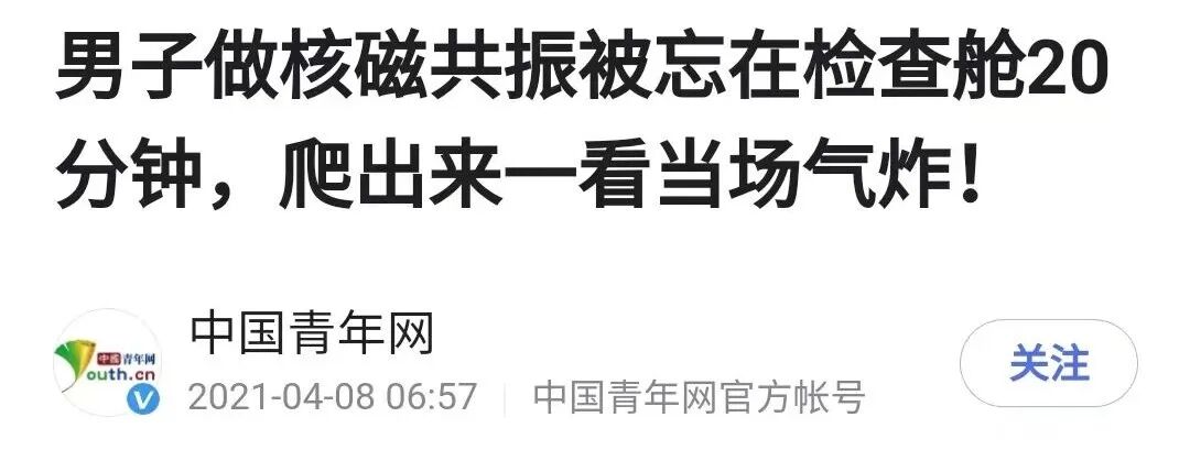 患者被医生忘在磁共振舱内并非个例,2021年,据中国青年网报道,河南一名男子做检查时就被遗忘在核磁舱内达到20分钟,这次更加离谱,竟然长达3个小时。