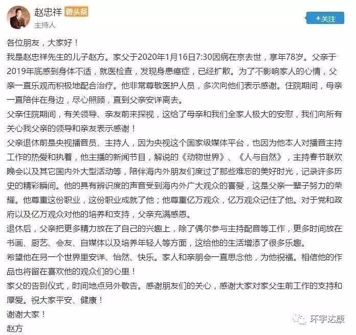 1月16日,本不是什么大日子,而一大早热搜,朋友圈就被赵忠祥老师不幸因病去世的噩耗刷屏。