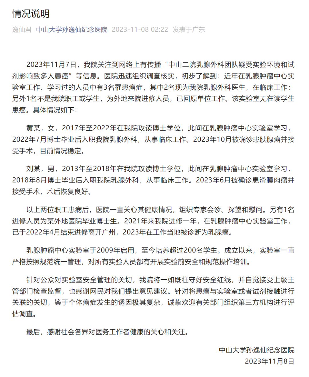 今日(11月8日)凌晨,广东中山二院(中山大学孙逸仙纪念医院,即广东中山大学第二附属医院)在其微信公众号对网传乳腺外科团队多名学生集体患癌的消息发布情况说明,全文如下: