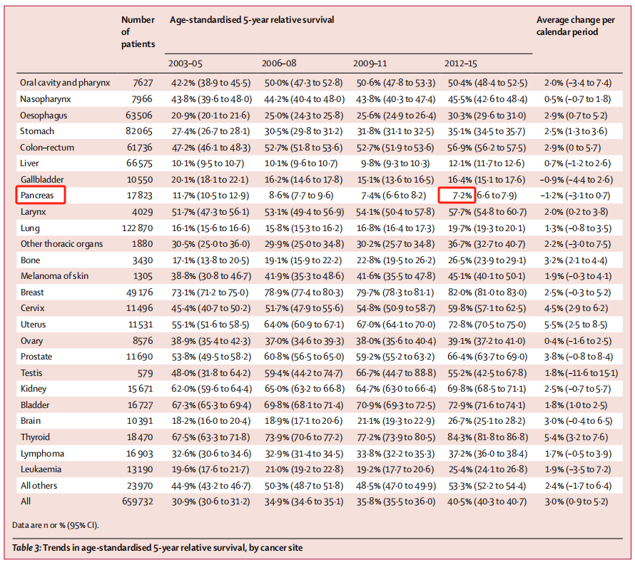 而根据2018年5月发表在《柳叶刀-全球健康》(The Lancet Global Health)上的研究论文,2012-2015年,我国胰腺癌患者5年生存率仅为7.2%。[2]
