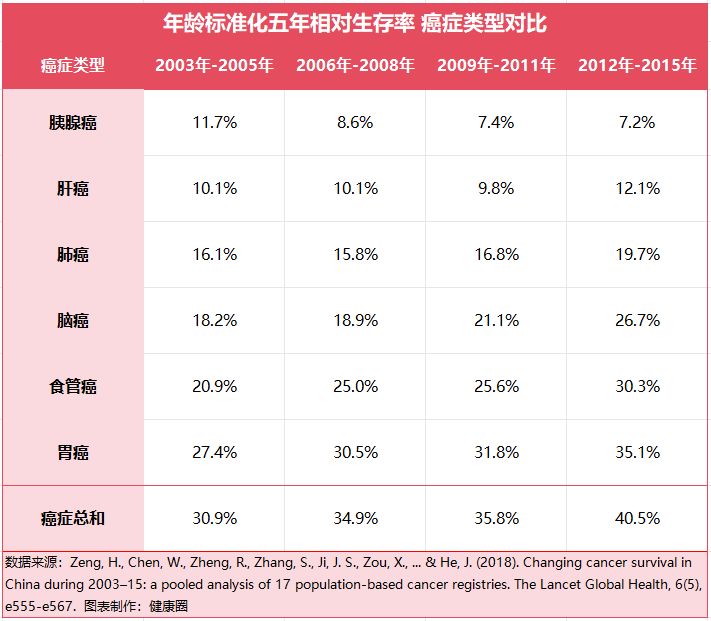 [1]Zeng, H., Chen, W., Zheng, R., Zhang, S., Ji, J. S., Zou, X., ... & He, J. (2018). Changing cancer survival in China during 2003–15: a pooled analysis of 17 population-based cancer registries. The Lancet Global Health, 6(5), e555-e567.
