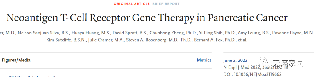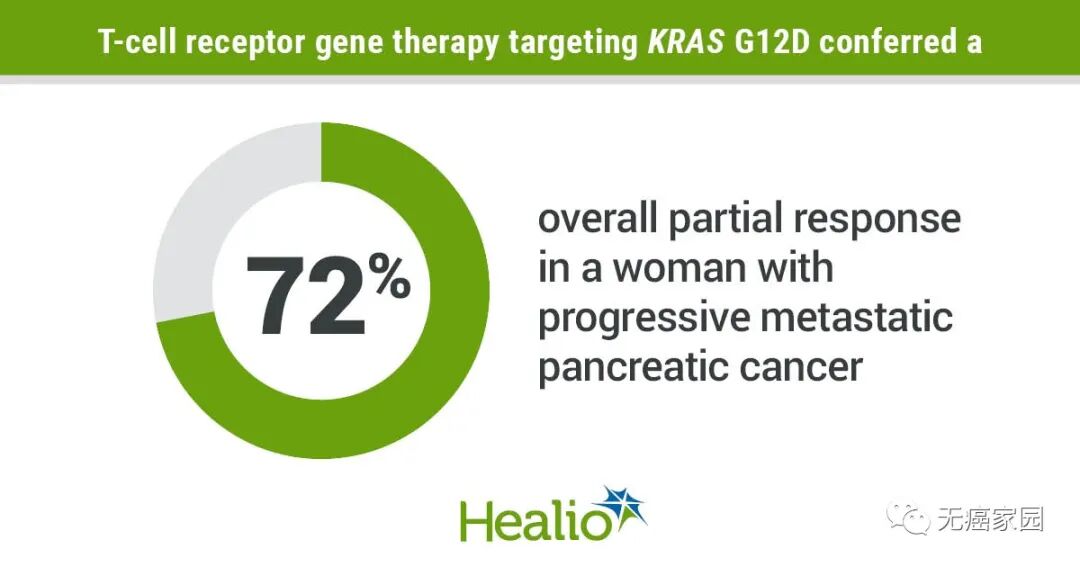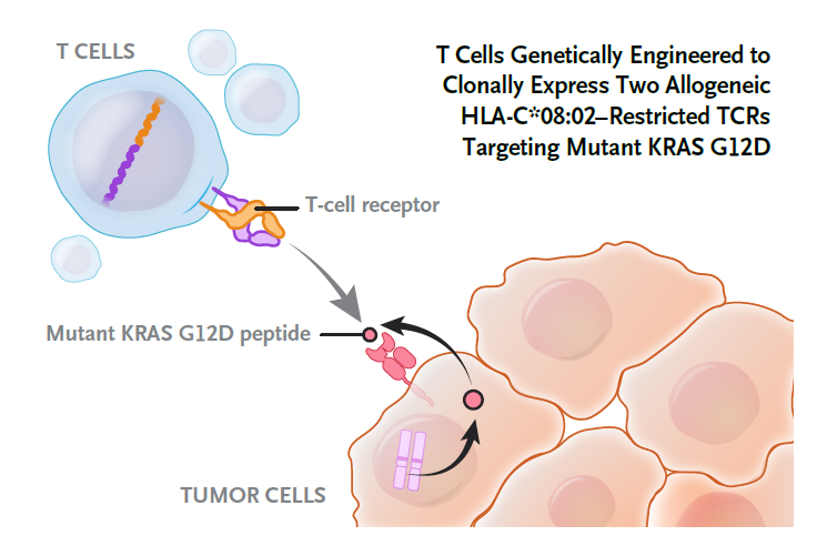 2022年6月2日,一项刊登在国际知名医学期刊《The New England Journal of Medicine》上的临床研究显示,一例既往接受过多种前期治疗的胰腺癌患者,采用T细胞抗原受体(TCR)细胞疗法治疗靶向肿瘤表达的KRAS G12D突变后,患者的内脏转移灶竟奇迹般地出现大面积消退,获得72%的部分缓解,且肿瘤持久性缩小。
