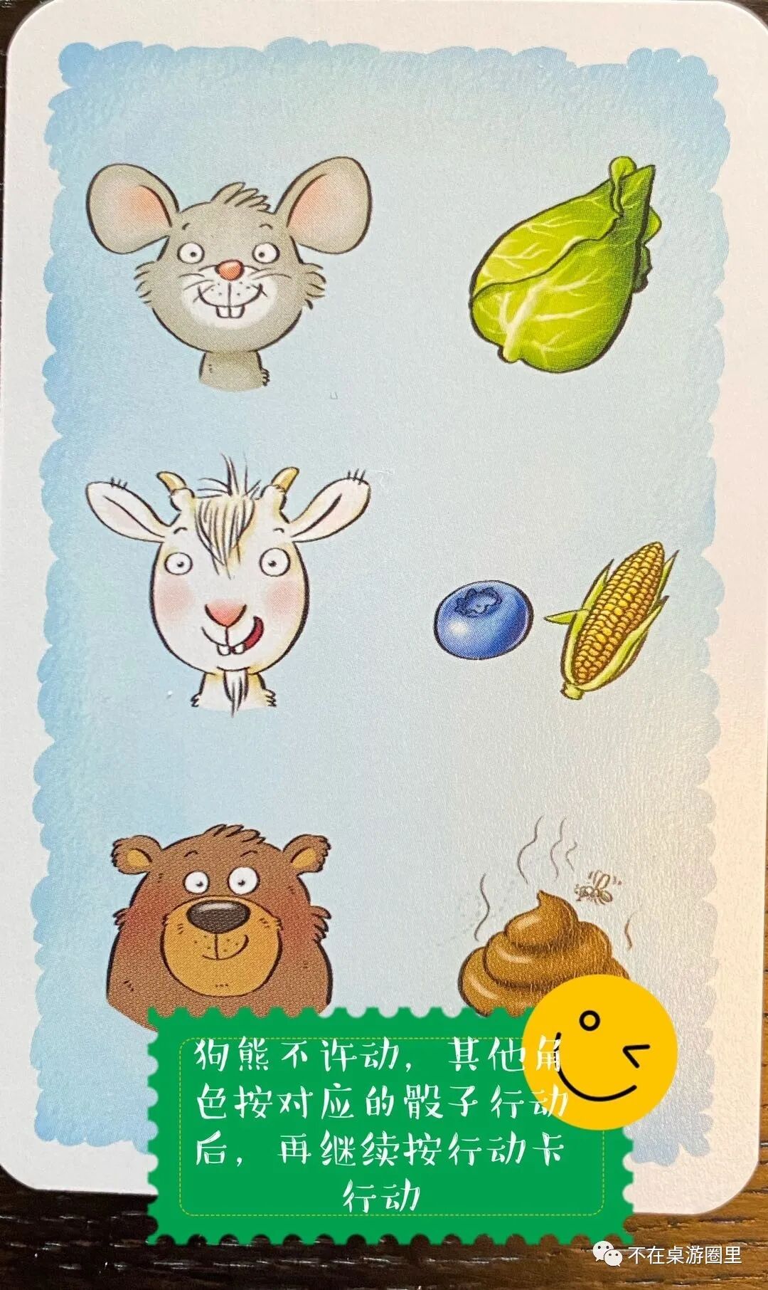 熊:行动骰子显示1/3几率掷到便便(不可以行动),其余最少可以前行两个玉米距离,要么不行动,要么行动最快。但也因为熊的优势太明显,很容易成为众矢之的。