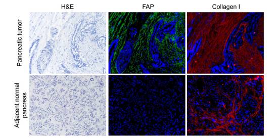 首先,研究人员对人类患者的组织样本进行了分析,发现FAP水平与预后相关。相比较于FAP水平较低的患者,在基质细胞中具有高水平FAP表达的患者的存活时间较短。在胰腺癌的小鼠模型中,研究表明消除FAP表达可将疾病发作延迟五周,与此同时延长了小鼠的总生存期(OS)36天。