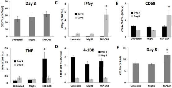 Wang教授及其同事发表的一篇论文表明,靶向FAP阳性细胞通过表位扩展增强抗肿瘤免疫。研究表明,免疫同源小鼠的间皮瘤和肺癌模型在接受抗FAP CAR治疗三天后,内源性CD4+T细胞活化,随后内源性CD69+,INFγ+CD8+ T细胞浸润数量增加。免疫缺陷小鼠不发生抗肿瘤反应,这表明适应性免疫系统的重要性。(相关论文:Targeting fibroblast activation protein in tumor stroma with chimericantigen receptor T cells can inhibit tumor growth and augment host immunitywithout severe toxicity)