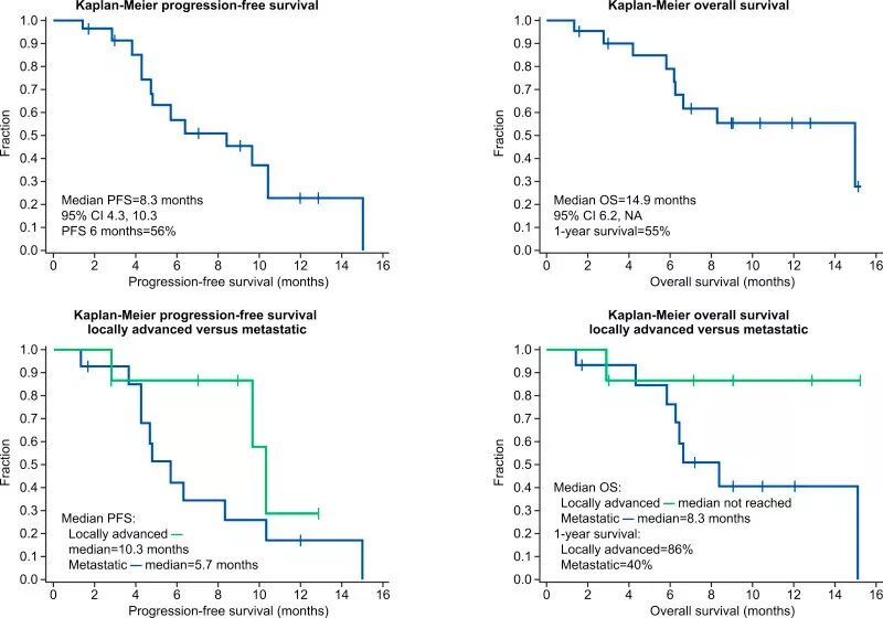 结果显示:电场疗法+吉西他滨治疗的晚期胰腺癌患者中位无进展生存期为8.3个月(95%CI 4.3,10.3),中位总生存期为14.9个月(95%CI 6.2,NA),在吉西他滨的历史对照中,分别为3.7个月和6.7个月,均延长两倍以上。