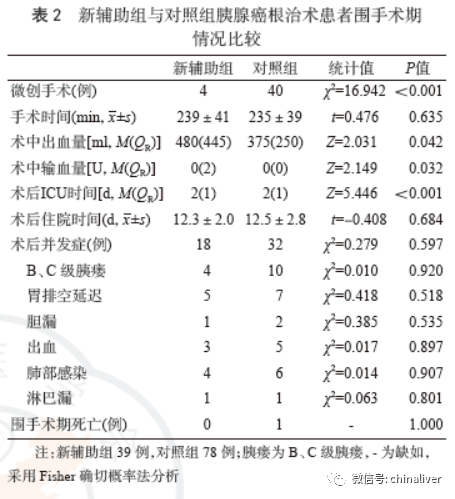 方法回顾性分析2018年7月至2021年6月在华中科技大学同济医学院附属协和医院行胰腺癌根治术的117例患者临床资料。其中男68例,女49例;年龄39~83岁,中位年龄61岁。患者均签署知情同意书,符合医学伦理学规定。将行新辅助治疗与同期未行新辅助治疗的患者按1∶2比例进行匹配分组,分为新辅助组(39例)和对照组(78例),匹配参数为肿瘤部位、术式、门静脉- 肠系膜上静脉切除重建和腹腔干切除。两组围手术期情况比较采用t检验或Wilcoxon秩和检验,术后并发症发生率、围手术期死亡率比较采用χ2检验或Fisher确切概率法。