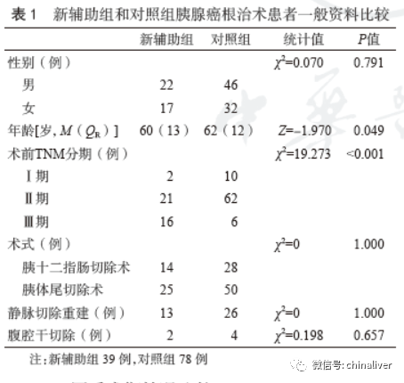 1.匹配分组:将按计划完成新辅助治疗后手术的患者与同期未行新辅助治疗的患者按1∶2比例进行匹配分组,分别为新辅助组(39例)和对照组(78例)。匹配参数为肿瘤部位、术式、门静脉-肠系膜上静脉切除重建和腹腔干切除(表1)。