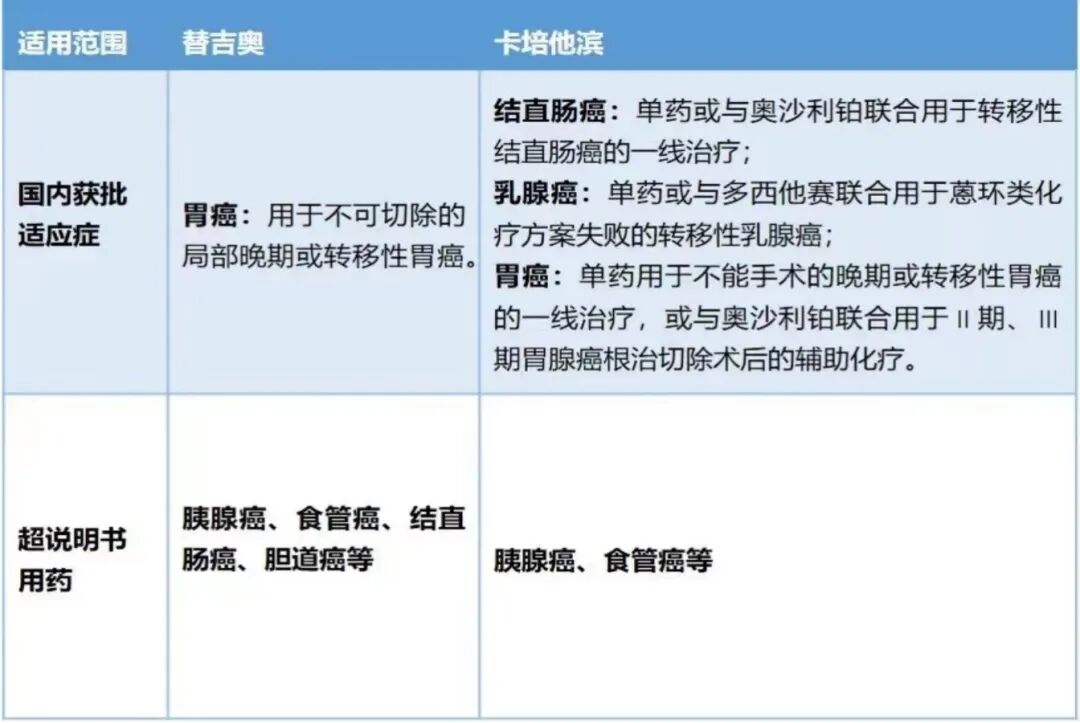 卡培他滨和替吉奥的应用范围有所差别:卡培他滨主要用于乳腺癌和结直肠癌和胃癌。替吉奥在日本目前已被批准用于治疗晚期胃癌、头颈部癌、直肠癌、非小细胞肺癌、转移性乳腺癌和胰腺癌等 7 类肿瘤疾病,已经成为日本治疗晚期胃癌的一线用药。在中国首先获批的适应症为不能切除的局部晚期或转移性胃癌。二者用于胰腺癌国内均属于超说明书使用。