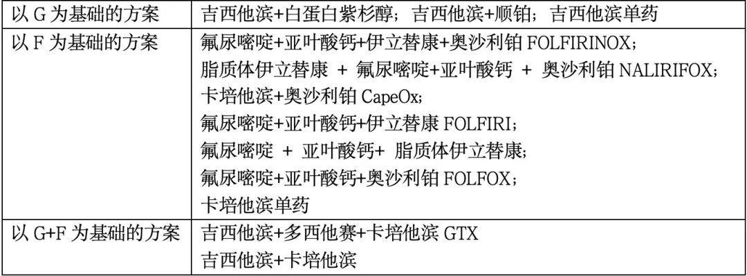 2023(v2)版 NCCN 指南晚期胰腺癌系统治疗方案推荐:转移性胰腺癌的化疗药物中,有两个「 骨干 」或「 基石 」、「 基础 」,一是吉西他滨,代号 G,二是氟尿嘧啶类,代号 F(可以通俗记忆 girlfriend 女朋友)。化疗方案可以分为三个「 兵团 」,① 以 G 为基础的方案;② 以 F 为基础的方案;③ G+F 方案。具体如下: