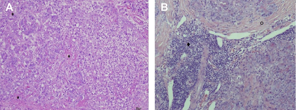 图1 (A) AP猫胰腺活检组织病理切片。部分胰腺实质被无核的无定形物质(液化性坏死)(星号)取代,并有中等数量的中性粒细胞(苏木精-伊红,原始放大X40)。(B) CP猫胰腺的组织病理学切片。注意周围广泛的纤维组织(◇)和腺泡组织以及淋巴细胞性炎症(a)(苏木精-伊红,原始放大X40)。