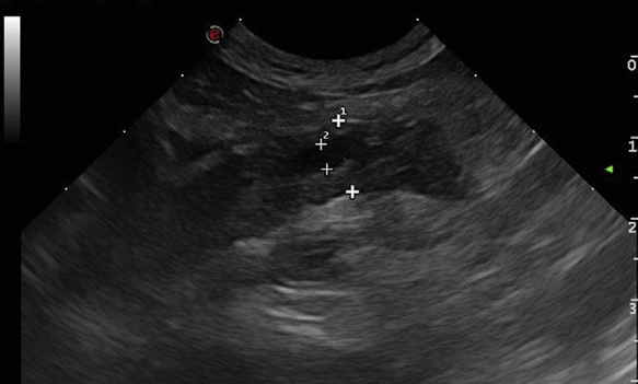 图2 急性胰腺炎猫的超声检查结果。注意胰腺低回声和增大,以及周围肠系膜高回声。胰管(由2个交叉点描绘)扩大,但这仍然是一个非特异性的发现。