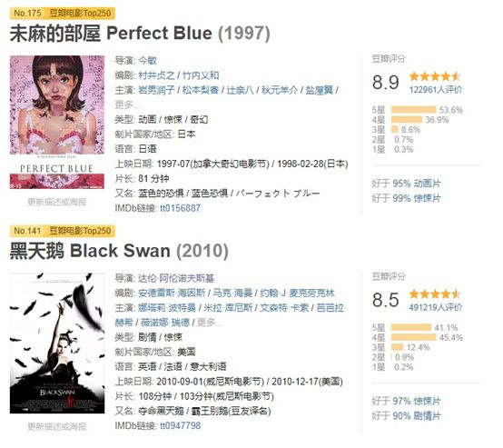 这样一部小成本动画,斩获了各电影节奖项,影响了世界范围内诸多电影人,其中的典型代表,达伦·阿伦诺夫斯基的《梦之安魂曲》,存在诸多与《未麻的部屋》雷同之处,且达伦说过想把《Perfect Blue》拍成真人电影,于是2010年就有了他导演的另一部作品《黑天鹅》,完完全全是《未麻的部屋》的影子。