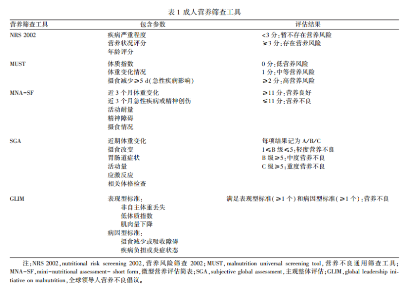 2术前营养评估与治疗2. 1营养筛查和营养评估患者入院后如何进行营养管理,美国肠外肠内营养学会建议:全程化的营养管理应包括营养筛查、营养评估、营养干预及营养监测[12]。营养风险是指营养相关因素对临床结局造成不利影响的风险,高营养风险对胰腺癌患者围手术期的影响体现在住院时间延长、住院费用增加、感染相关并发症发生率增高[13]。通过量化的工具可以判断营养风险,常用的营养筛查工具包括营养风险筛查2002 (NRS 2002),营养不良通用筛查工具(MUST),微型营养评估简表(MNA-SF)等(表1)。