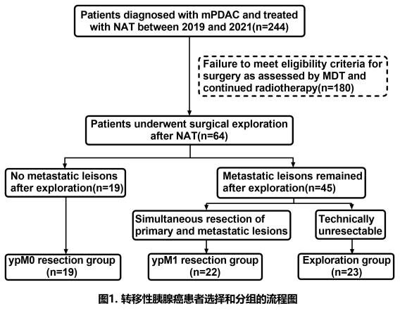 本文从上述临床问题入手,探索诱导治疗后转化手术的临床结局和潜在获益人群。从长海医院肝胆胰脾外科前瞻性结构化数据库中确认了2019年至2021年间确诊为mPDAC并接受诱导治疗的244名患者,其中64名(26.2%)成功接受了手术探查。根据切除程度和术后病理结果,将患者分为完全病理反应组(ypM0,即转移灶消失、原发灶切除)、残余转移灶同步切除组(ypM1,即原发灶和转移灶同步切除)和探查组(原发灶和转移灶均未能切除)。