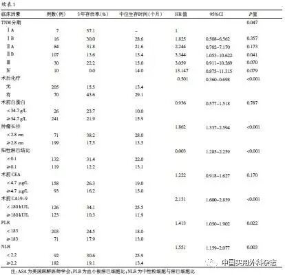 1.2 分析指标 (1)一般情况:年龄、性别、体重下降、ASA分级、手术方式。(2)术前检查:白蛋白、中性粒细胞与淋巴细胞比(neutrophil-lymphocyte ratio,NLR)、血小板淋巴细胞比(platelet-lymphocyte ratio,PLR)、癌胚抗原(CEA)和CA19-9。(3)术中情况:术中失血量、是否扩大切除。(4)总体并发症发生情况。(5)术后病理学指标:肿瘤分化水平、肿瘤长径、血管侵犯、神经侵犯、T分期、阳性淋巴结比、远处转移(M分期)、断端切缘状态。(6)术后化疗。其中,R0和R1切除以断端切缘是否有镜下肿瘤累及为判断标准,胰腺癌分期参照美国癌症联合委员会(AJCC)第7版TNM分期标准,扩大切除标准则参照文献[3]国际胰腺外科研究小组(ISGPS)定义。
