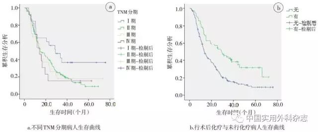 中位随访时间为18个月,四分位间距为9~36个月,截至最后一次随访,共有216例(78.5%)病人死亡。病人总体中位生存时间为15.1个月(95%CI 11.7~18.4),1、3、5年存活率分别为63.2%、23.1%、11.8%。TNM分期Ⅰ~Ⅳ期病人的中位存活时间分别为29.0个月(95%CI 14.1~43.9)、15.0个月(95%CI 10.9~19.1)、15.0个月(95%CI 13.1~16.9)和14.0个月(95%CI 8.8~19.2),生存曲线如图1a所示。行术后化疗病人及未行化疗病人的中位生存时间分别为29.1个月(95%CI 19.5~38.7)和13.4个月(95%CI 11.3~15.5),两组病人1、3、5年存活率分别为78.6%、43.6%、25.4%和57.9%、15.5%、6.0%,生存曲线如图1b所示。