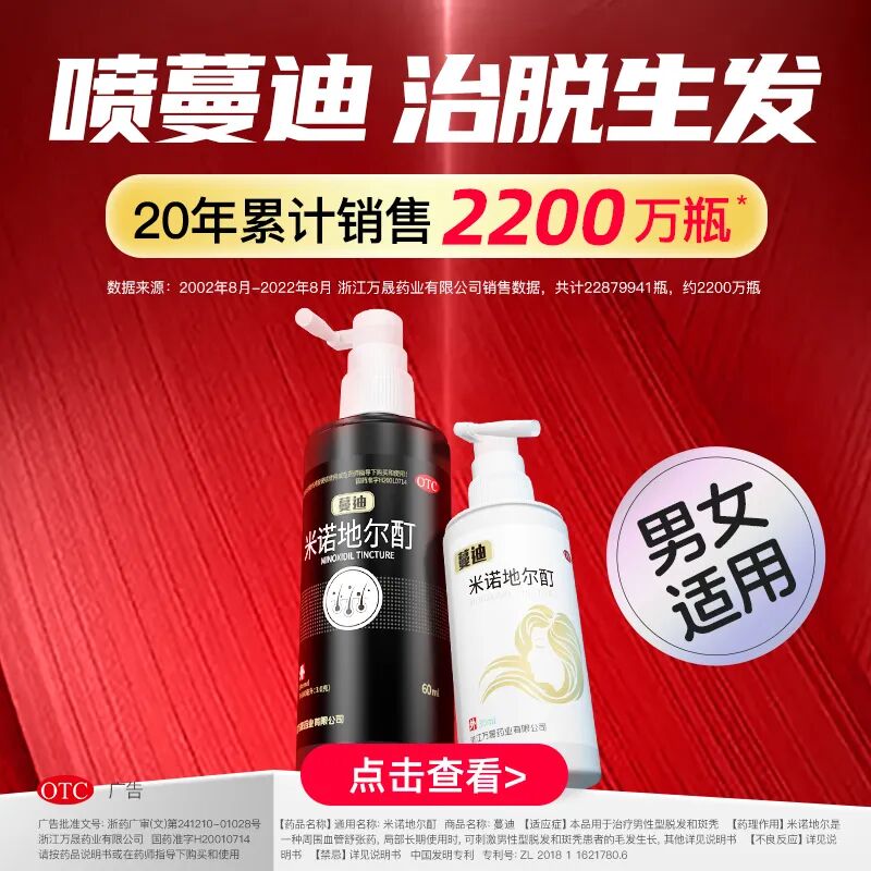 蔓迪米诺地尔酊(国药准字号 OTC)含 5% 米诺地尔,可用于治疗雄脱、斑秃。