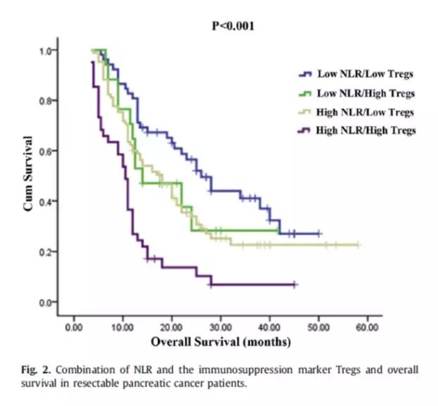 调节性T细胞(Tregs)是免疫抑制细胞,可以在外周血中用流式细胞术检测,我们团队在前期研究发现Tregs在胰腺癌患者中较正常人明显升高,并与胰腺癌的分期明显相关,同时也是胰腺癌的独立预后因素。因此我们推测,如果胰腺癌患者炎症反应较重(NLR升高),同时免疫状态较差(Tregs升高),可能生存时间最短。