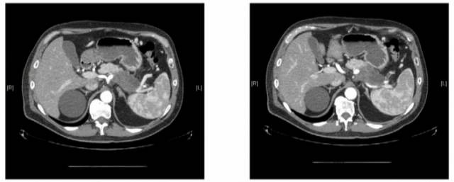 通过胰腺癌CT血管造影增强图像可以看到,胰体尾部的肿块是在局部,但是侵犯到周围血管,因此认为是局部进展期胰腺癌。