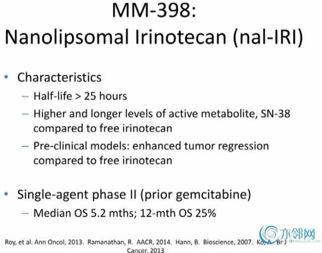 MM-398是纳米脂质体的伊立替康,被美国FDA批准用于晚期胰腺癌二线治疗,这种药物有一系列特点:如半衰期较长,大于25小时;活性代谢产物SN-38比普通伊立替康的有效性和浓度更高,持续时间更长;前期临床研究显示,该药物比普通伊立替康能更好的抑制肿瘤发展。