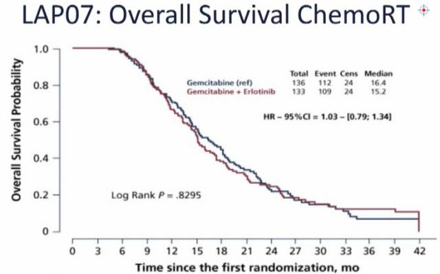 欧洲进行的LAP-07研究针对局部进展期胰腺癌,将900例患者随机分为两组,分别接受吉西他滨单药,或吉西他滨联合厄洛替尼。结果显示,两组的OS没有显著差异;治疗时加或不加局部放化疗,结果显示两者之间没有显著差异,加入放化疗没有获益,但三维调强放疗时一些亚组可能有获益。