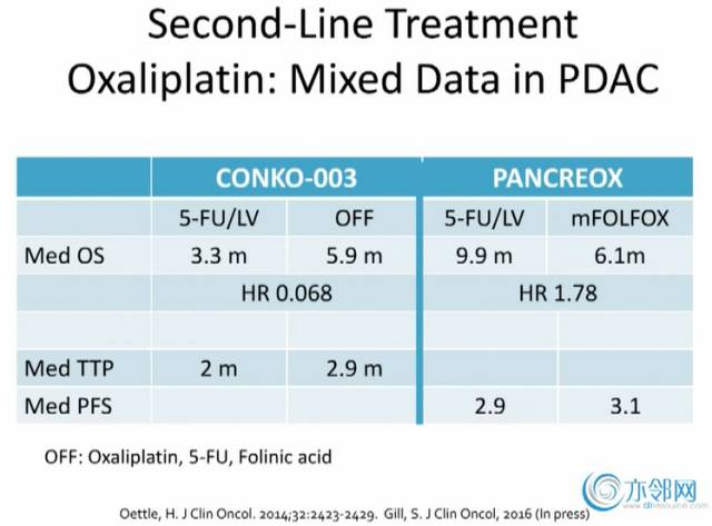 二线治疗中关于奥沙利铂有两项研究,CONKO-003和PANCREOX,前者数据已经发布,后者即将发布。CONKO-003研究中对比了5-FU/LV,5-FU/LV联合奥沙利铂的效果,结果显示联合组的中位OS、TTP优于单药组。但PANCREOX研究中5-FU/LV单药组的中位OS更长。