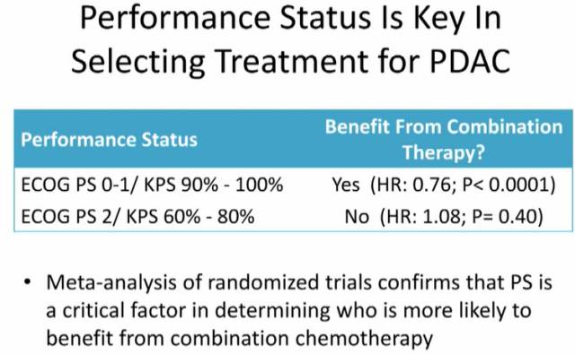 晚期胰腺癌患者治疗时非常重要的一点是PS评分,PS评分较好的患者,联合治疗更能耐受,预后较好;PS评分较差患者,耐受性不好,预后不好。