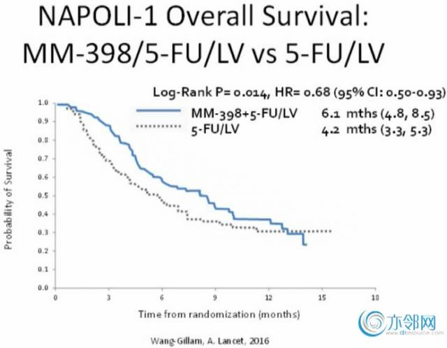 试验NAPOLI-1是MM-398被批准用于晚期胰腺癌二线治疗的一项重要研究,研究中分为三组,一组接受MM-398,一组接受5-FU/LV,一组接受M398+5-FU/LV。结果显示,MM-398+5-FU/LV与5-FU/LV单药相比,联合组的OS、PFS都显著延长;MM-398与5-FU/LV相比,两组的OS没有显著差异,因此不推荐MM-398单药用于晚期胰腺癌治疗。基于这项研究,目前在美国M398联合5-FU/LV方案已经被广泛用于晚期胰腺癌二线治疗。