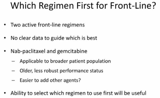 这里可能需要做一个选择,哪个是治疗晚期胰腺癌的更好方案。白蛋白紫杉醇联合吉西他滨适用范围更加广泛,对于年纪较大、PS评分较差的患者使用该方案可能更好;FOLFIRINOX方案可能更适用于PS评分较好的患者。
