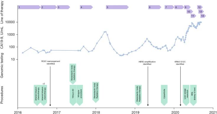 总之,本文报告了一名被诊断患有转移性胰腺癌的患者存活了近 5 年的案例。这则案例展示了在重复基因检测中发现有利的靶向突变后快速改变临床治疗和管理的重要性。