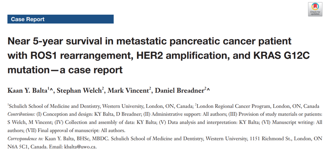 Balta KY, Welch S, Vincent M, Breadner D. Near 5-year survival in metastatic pancreatic cancer patient with ROS1 rearrangement, HER2 amplification, and KRAS G12C mutation-a case report. J Gastrointest Oncol. 2023 Oct 31;14(5):2273-2278. doi: 10.21037/jgo-23-190. Epub 2023 Sep 25. PMID: 37969830; PMCID: PMC10643575.