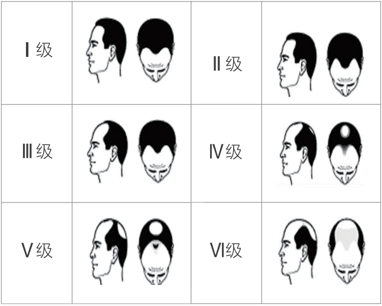 患者可表现为前额发际线后退,两侧额角上移,呈现出M型外观。可伴有头顶部毛发密度降低,也可仅表现为头顶部毛发均匀稀疏,前额发际线后移不明显。女性患者则通常只表现为头顶部毛发对称性稀疏,形成两头窄、中间宽的圣诞树样外观。