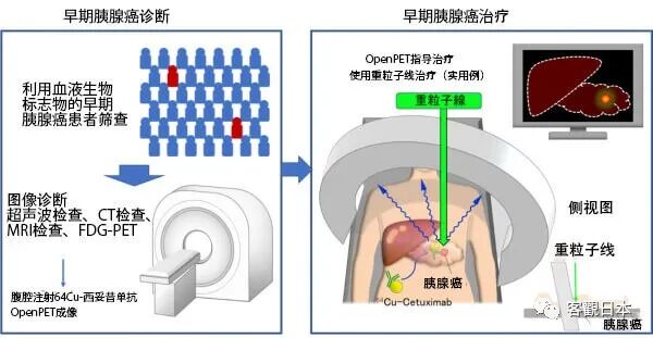 图2:该技术的未来展望。该技术的未来临床应用示例。对于在血液生物标志物检查中发现的胰腺癌疑似患者(红色),首先进行常规的图像诊断。诊断为阴性的早期患者,再腹腔注射64Cu-西妥昔单抗后利用OpenPET成像。如果是阳性,就进行重粒子线治疗。