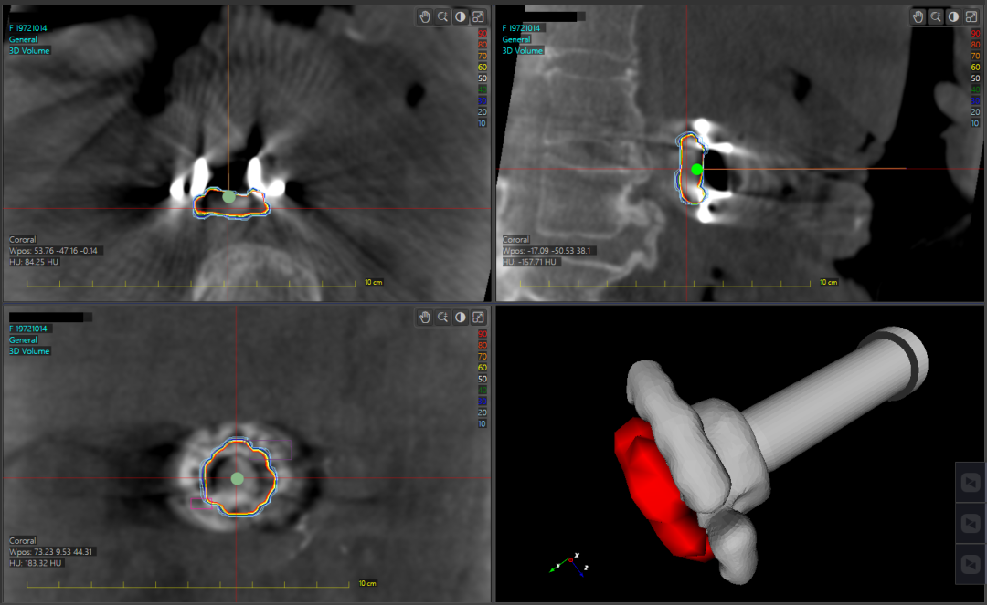 基于以上优势以及医院具备的国际先进设备与技术,治疗团队自主研发了一套基于术中CT三维成像的三维术中放疗计划系统,通过这套系统,医生能够在手术过程中,准确判断术中放疗的区域并进行靶区的勾画,还能够直观看见术中放疗部位与复发风险较高区域的三维剂量分布信息,从而更准确、高效的判断术中放疗效果,还能更细致地保护周围组织器官。