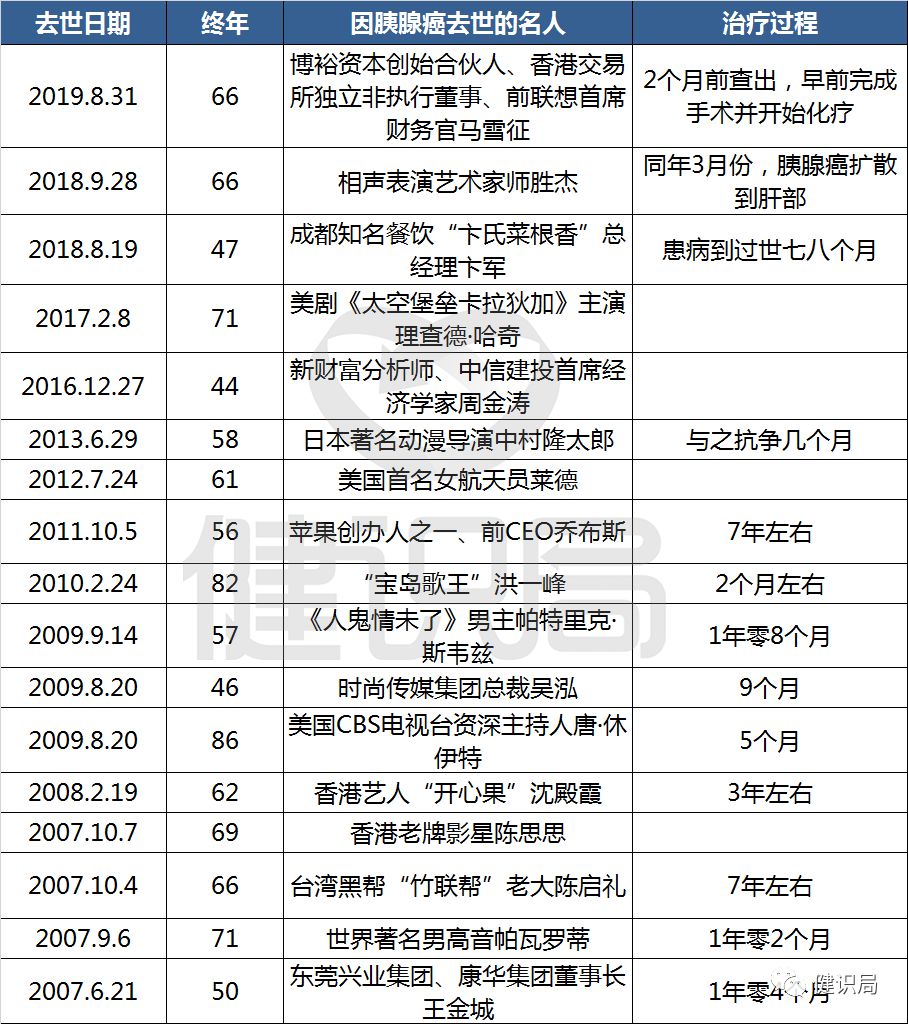 无疑,胰腺癌是夺取人们生命的罪魁祸首。据健识局不完全统计,2007年至今,已有数十位名人公开因此去世。