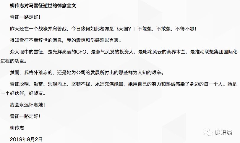 此后,联想董事长柳传志于9月2日发文悼念,称马雪征是光鲜亮丽的CFO、是意气风发的投资人、是叱咤风云的商界木兰、是推动联想集团国际化进程的功臣。柳传志表示我会永远怀念她!
